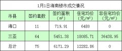 据海南省住宅与房地产信息网网上签约系统显示,1月1日海南签约商品房75套,签约面积6171.29㎡,签约住宅均价12282.86元/㎡。(注:以上数据为当日海口,三亚网签备案统计结果,不代表...