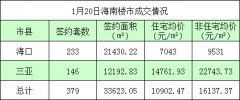 据海南省住宅与房地产信息网网上签约系统显示,1月20日海南签约商品房379套,签约面积33623.05㎡,签约住宅均价10902.47元/㎡。(注:以上数据为当日海口,三亚网签备案统计结果,不代...