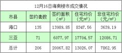 据海南省住宅与房地产信息网网上签约系统显示,12月16日海南签约商品房206套,签约面积20067.82㎡,签约住宅均价13026.07元/㎡。(注:以上数据为当日海口,三亚网签备案统计结果,不...