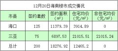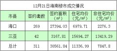 据海南省住宅与房地产信息网网上签约系统显示,12月20日海南签约商品房200套,签约面积18276.92㎡,签约住宅均价12465.2元/㎡。(注:以上数据为当日海口,三亚网签备案统计结果,不代...