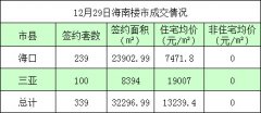 据海南省住宅与房地产信息网网上签约系统显示,12月29日海南签约商品房339套,签约面积32296.99㎡,签约住宅均价13239.4元/㎡。(注:以上数据为当日海口,三亚网签备案统计结果,不代...
